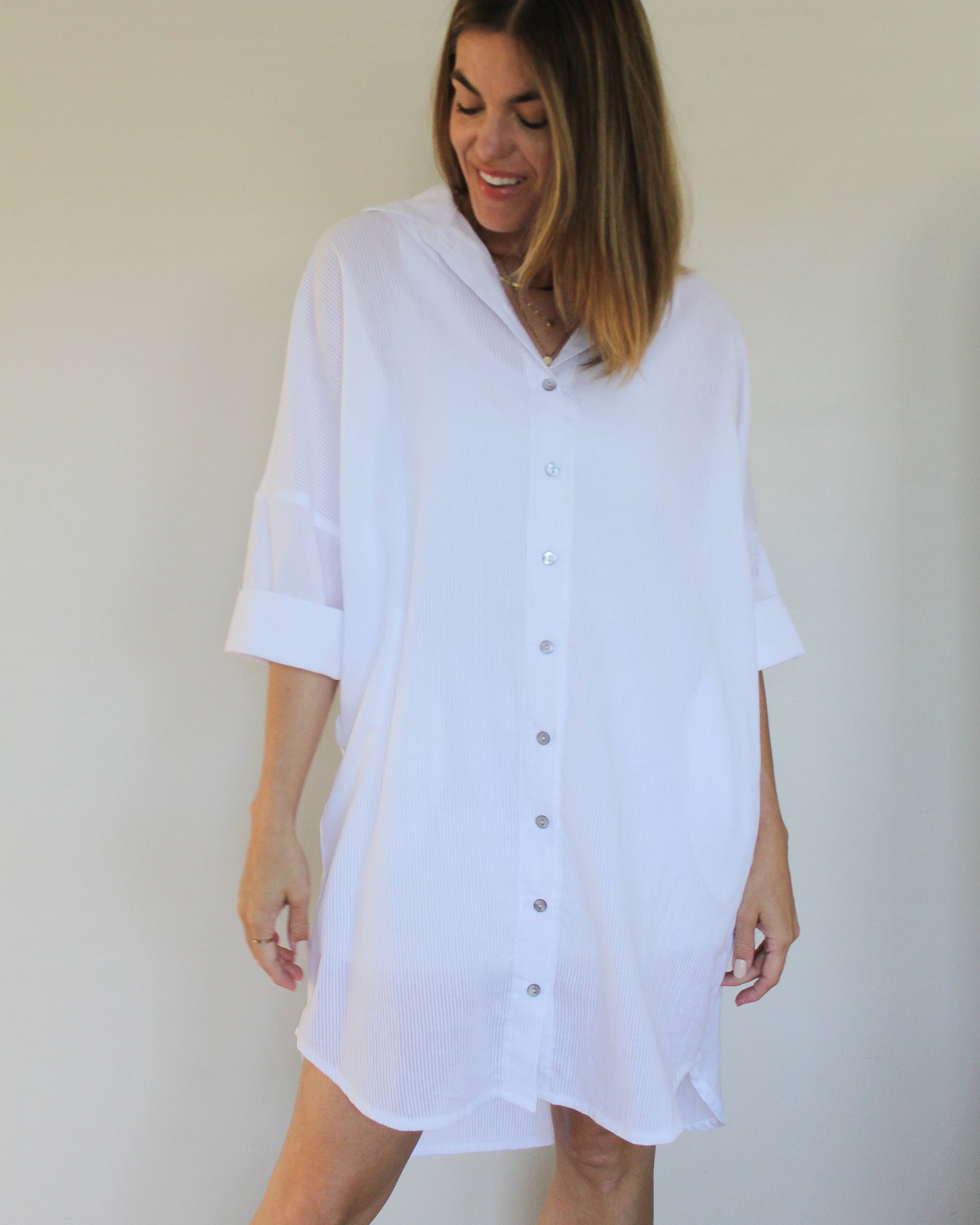 Our classic Dova Shirt Dress, with her beautifully relaxed fit, shell button-down front and casually rolled sleeves, is all about versatility and comfort.