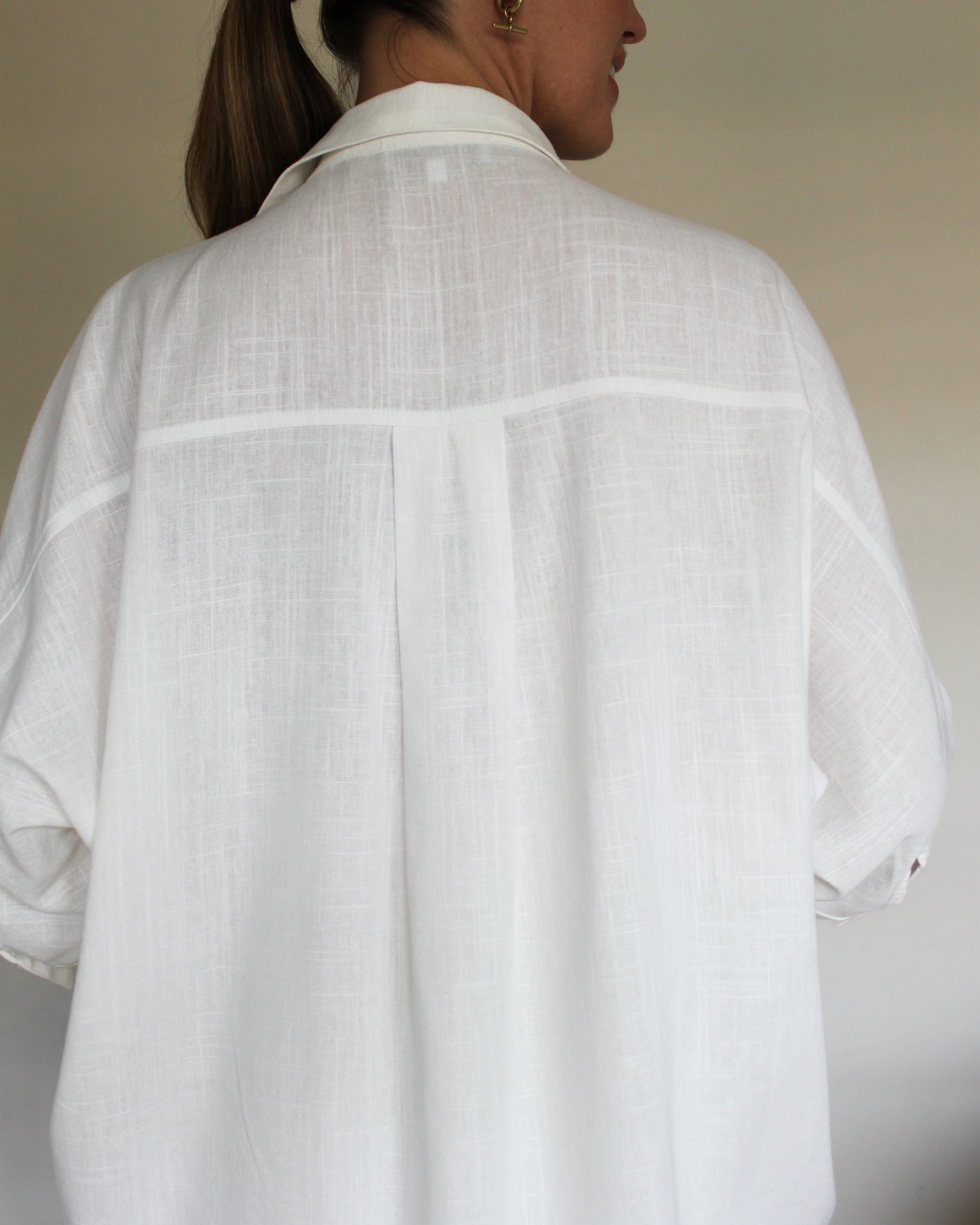Designed for ultimate comfort and versatility, this two-piece features an oversized button-up shirt with natural shell buttons, paired with relaxed high-waisted shorts.