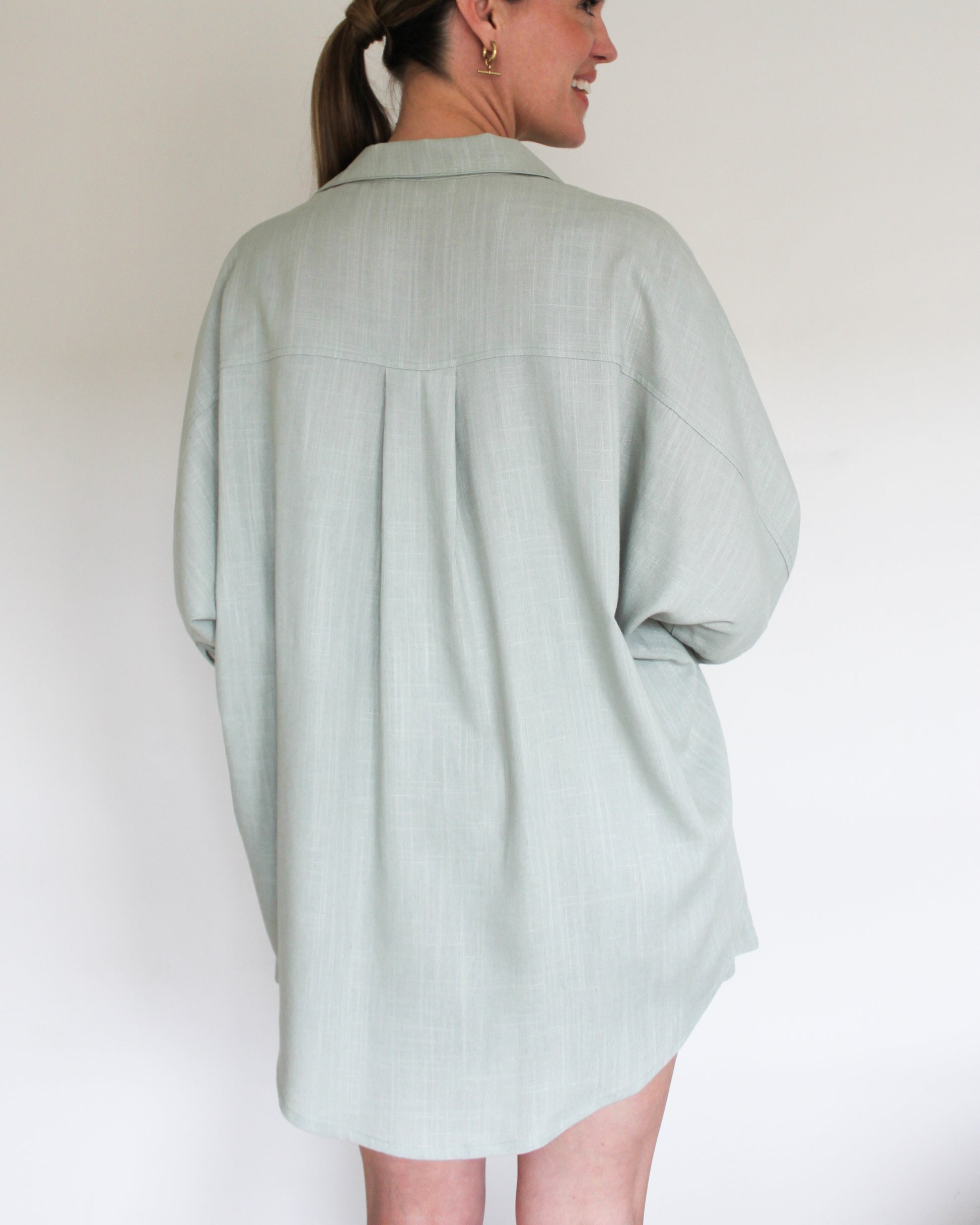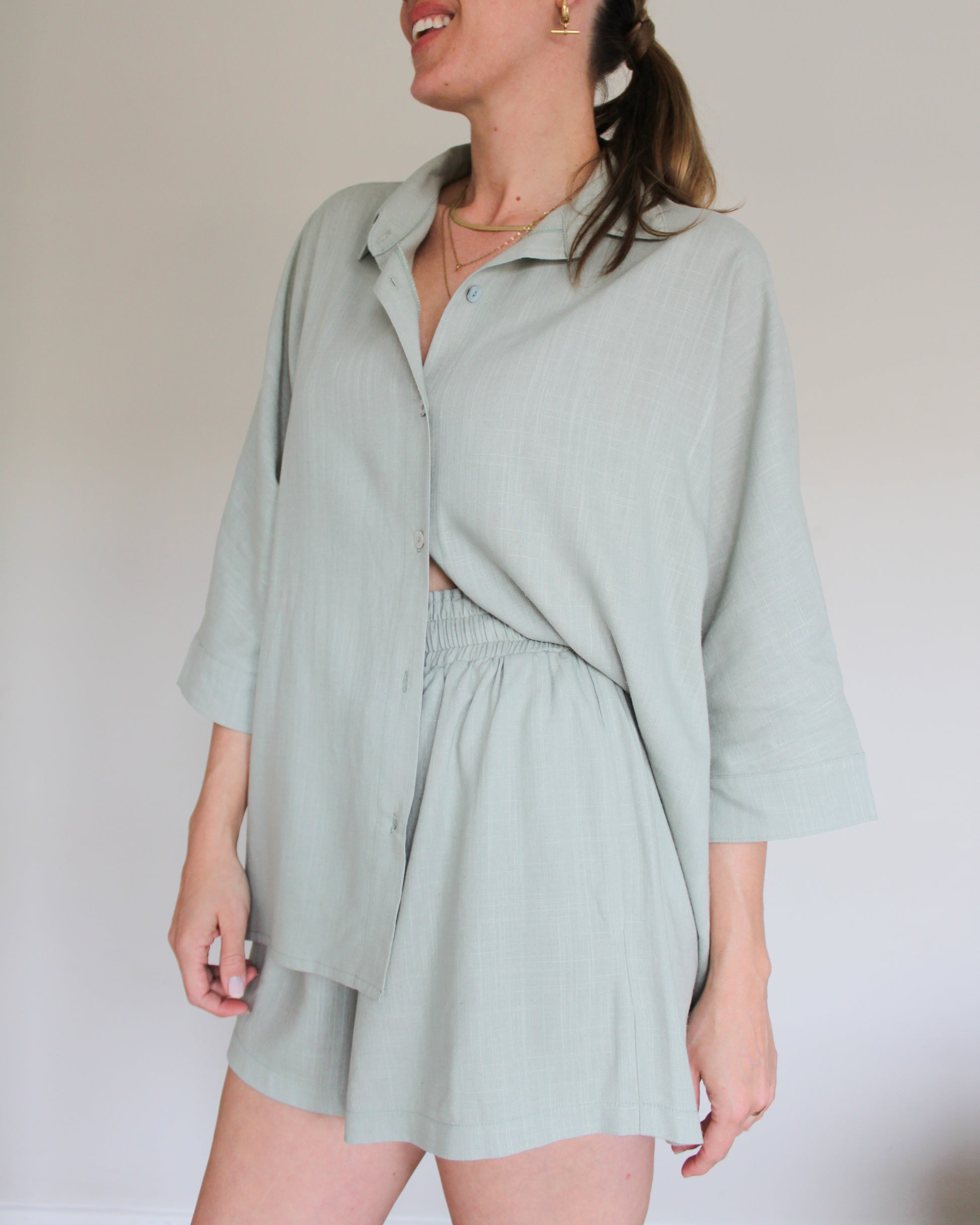 Designed for ultimate comfort and versatility, this two-piece features an oversized button-up shirt with natural shell buttons, paired with relaxed high-waisted shorts.